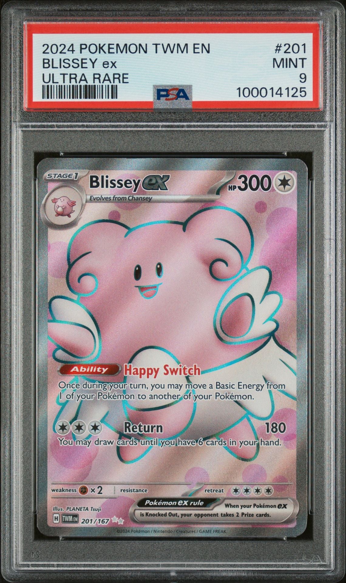 This 2024 Pokemon TWM En-Twilight Masquerade 201 Blissey EX Ultra Rare PSA Mint 9 card is a highly collectible item for fans and investors alike. With a PSA Mint 9 grade, this card is guaranteed to be in top condition, providing a valuable addition to any collection or investment portfolio.